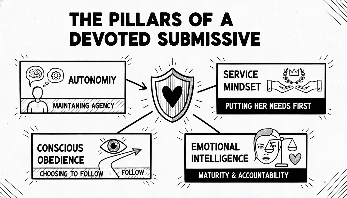 He retains agency. He retains accountability. He retains the ability to think, decide, and act. What he gives up—willingly—is control, in service of a woman he chooses to serve.